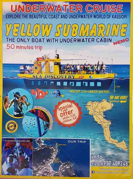 Το “ΝΕΜΟ” το κίτρινο υποβρύχιο της Κέρκυρας, είναι ένα σκάφος τελευταίας τεχνολογίας και το μοναδικό με υποβρύχια καμπίνα, 2,20 μέτρα μέσα στο νερό και σας υπόσχεται ότι θα σας συναρπάσει με τα μοναδικά ταξίδια του!